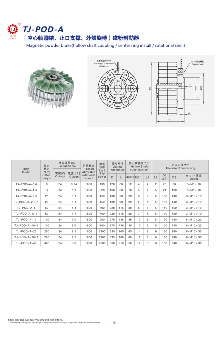 東莞天機傳動生產廠家制造的中空軸磁粉剎車器又稱外殼旋轉磁粉剎車器;中空軸磁粉剎車器熱容量很大:由于使用了耐熱性優的磁粉及運用了理想的冷卻方法。即使是過于嚴酷的連續滑動運轉,采用的是DC24V直流安全電壓,也可以安心使用。外殼旋轉磁粉剎車器型號有:TJ-POD-A-0.6、TJ-POD-A-1.5、TJ-POD-A-2.5、TJ-POD-A-5、TJ-POD-A-10、TJ-POD-A-20、TJ-POD-A-40等更大的磁粉剎車器;
