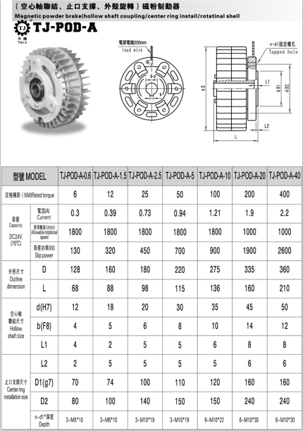 內(nèi)旋轉(zhuǎn)空心軸磁粉制動器的規(guī)格有:TJ-POD-A-0.6、TJ-POD-A-1.5、