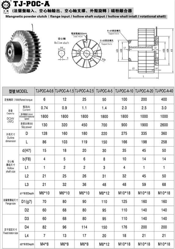 中空軸磁粉離合器廠家型號分為:TJ-POC-A-0.6、TJ-POC-A-1.5、TJ-POC-A-2.5、TJ-POC-A-5、TJ-POC-A-10、TJ-POC-A-20、TJ-POC-A-40;等更大轉(zhuǎn)矩的磁粉離合器。空心磁粉制動器和中空軸磁粉離合器廠家型號表如下: